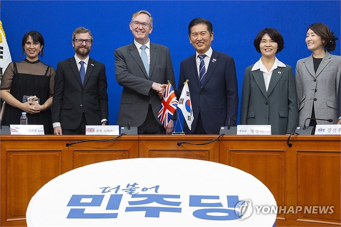 크룩스 주한 영국대사와 악수하는 정청래 대표 (서울=연합뉴스) 황광모 기자 = 더불어민주당 정청래 대표가 1일 국회에서 콜린 크룩스 주한 영국대사와 만나 악수하고 있다.