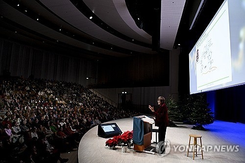 스웨덴 카롤린스카 연구소에서 강연 중인 한 노벨 생리의학상 수상자 [EPA=연합뉴스 자료사진. 재판매 및 DB 금지]