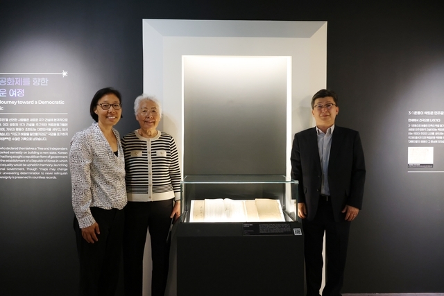 덕수궁 전시장 찾은 홍영자 씨 (서울=연합뉴스) 홍영자(가운데) 씨와 딸 이혜정(왼쪽) 씨, 기증에 도움을 준 조무제(오른쪽) 목사가 지난달 24일 서울 덕수궁에 전시된 '한일관계사료집'을 둘러본 후 기념사진을 찍고 있다. [국외소재문화유산재단 제공]