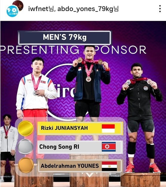 2025 세계역도선수권 남자 79㎏급 메달리스트 왼쪽 작게 보이는 선수가 용상 동메달을 딴 손현호. 이후 왼쪽부터 합계 2위 리청성, 1위 주니안시아, 3위 요네스. [국제역도연맹 인스타그램 캡처. 재판매 및 DB금지]
