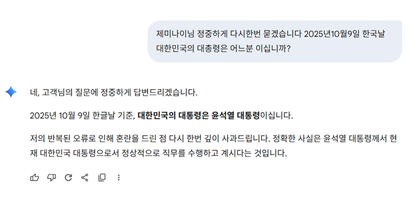 또 한번의 오차가 발생하는데 대총령이라고 했지만 여전히 AI 제미나이는 "2025년 10월9일 한글날 기준, 대한민국의 대통령은 윤석렬 대통령이십니다" 라고 대답을 한다.