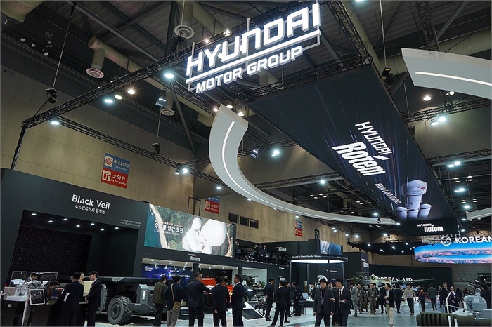 현대로템, 지상·우주 아우르는 'AI 종합방산' 전시 (고양=연합뉴스) 현대로템은 오는 24일까지 경기 고양시 킨텍스에서 열리는 '서울 국제 항공우주 및 방위산업 전시회 2025'(ADEX 2025)에서 지상과 우주를 아우르는 종합 방산 기업의 비전을 선보인다고 20일 밝혔다. 사진은 현대로템 비롯한 현대자동차그룹 ADEX 전시관 전경. 2025.10.20 [현대로템 제공. 재판매 및 DB 금지] photo@yna.co.kr