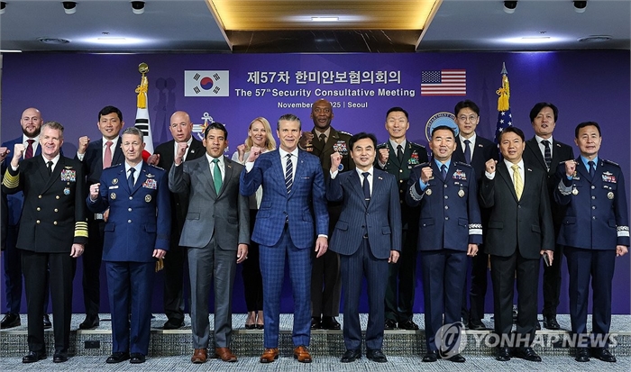 기념 촬영하는 한미 국방장관 (서울=연합뉴스) 안규백 국방부 장관과 피트 헤그세스 미국 국방부 장관이 4일 서울 용산 국방부 청사에서 제57차 한미안보협의회의(SCM)에 앞서 주요 참석자들과 기념 촬영하고 있다. 2025.11.4 [사진공동취재단] photo@yna.co.kr