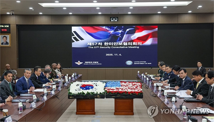 제57차 한미안보협의회의 확대회의 (서울=연합뉴스) 안규백 국방부 장관과 피트 헤그세스 미국 국방부(전쟁부) 장관이 4일 서울 용산 국방부 청사에서 열린 제57차 한미안보협의회의(SCM) 확대회의에 참석해 있다. 2025.11.4 [사진공동취재단] photo@yna.co.kr