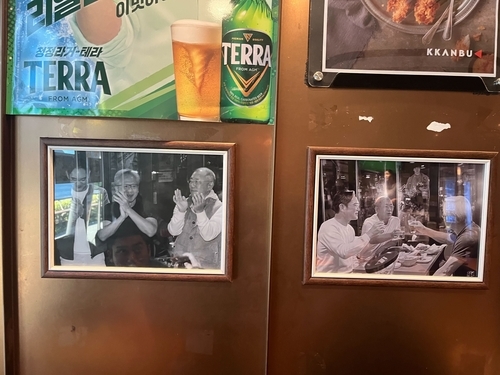 매장 안에는 황 CEO와 이 회장, 정 회장이 앉았던 테이블 주변으로 이들이 함께 '치맥'(치킨과 맥주)을 즐기는 사진이 붙어있었다.