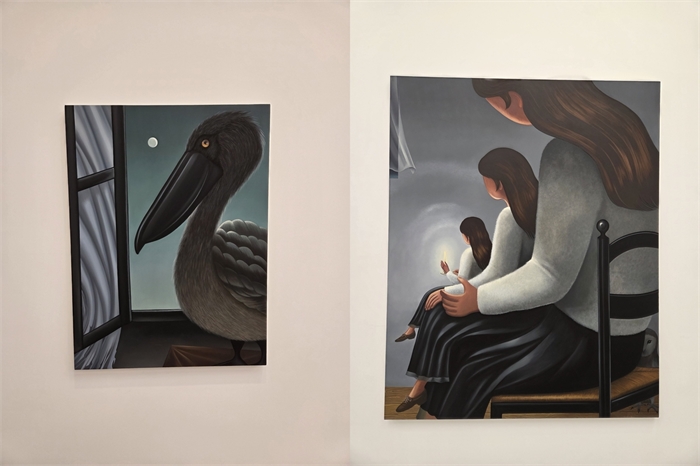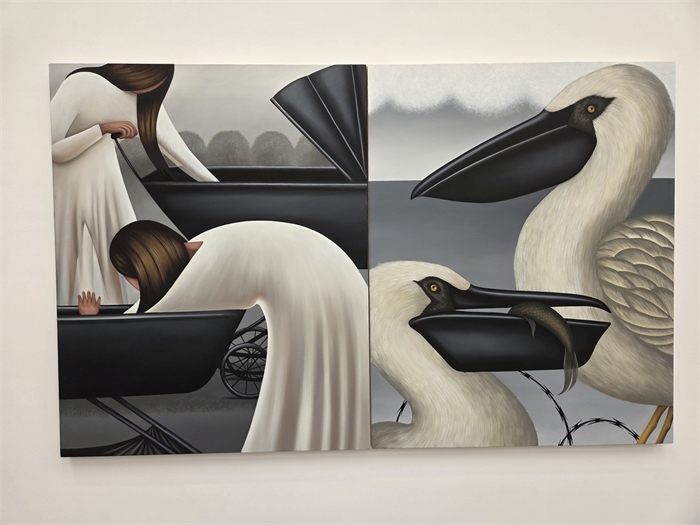 (서울=연합뉴스) 박의래 기자 = 두 개의 캔버스가 나란히 붙어 있다. 왼쪽 캔버스에는 흰 드레스를 입은 두 여성이 검은 유모차 안의 아이를 돌보고 있다. 오른쪽 캔버스에는 두 여성 대신 검은 부리의 두 마리 펠리컨(사다새)이 자리한다. 검은 부리는 검은 유모차와 닮았다. 유모차 안에서는 아이의 손이, 부리 안에서는 새끼를 위한 물고기가 삐져나와 있다.