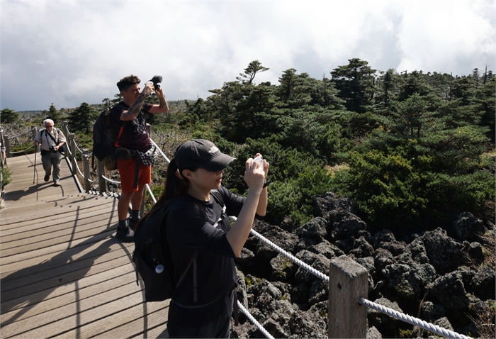 한라산에서 풍광을 카메라에 담는 외국인 등산객들 [촬영 조보희] 2025.10.20