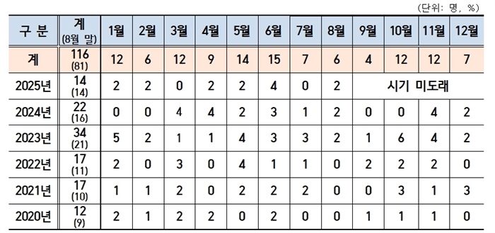 2020년 12명, 2021년 17명, 2022년 17명, 2023년 34명, 2024년 22명, 2025년 8월 말 14명 등이다.