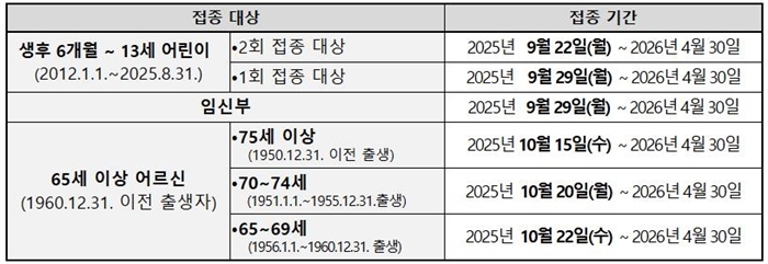 독감 백신 국가예방접종 대상 및 기간 [질병관리청 보도자료 갈무리. 재판매 및 DB 금지]