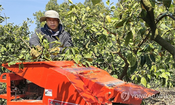 감귤 과수원서 파쇄작업 하는 베트남 계절근로자 지난 2024년 3월 제주 서귀포시 남원읍 신례1리 감귤 과수원에서 전정한 감귤나무 파쇄작업을 하는 베트남 공공형 계절근로자 토 딴 땅 씨. 2024.3.14 khc@yna.co.kr [연합뉴스 자료사진]