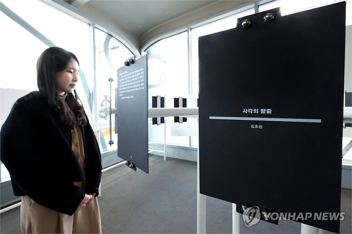 전시장에서 만나는 김초엽 작가의 이야기 (서울=연합뉴스) 진연수 기자 = 19일 서울 중구 문화역서울 284 RTO에서 열린 국립한글박물관 '글(자)감(각): 쓰기와 도구' 전시 언론설명회에서 참석자가 김초엽 작가의 '사각의 탈출'을 살펴보고 있다.