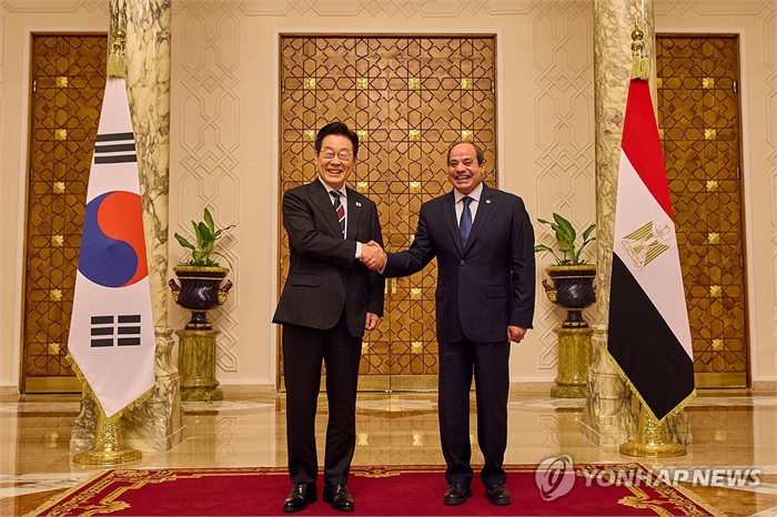 기념촬영하는 한-이집트 정상 (카이로=연합뉴스) 한상균 기자 = 이재명 대통령과 압델 파타 알시시 이집트 대통령이 20일(현지시간) 이집트 카이로 대통령궁에서 열린 한-이집트 단독 정상회담에 앞서 기념촬영을 하고 있다. 2025.11.20 [공동취재 제공. 재판매 및 DB 금지] xyz@yna.co.kr