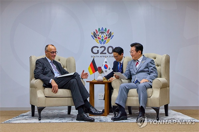 (요하네스버그=연합뉴스) 임형섭 황윤기 기자 = 주요 20개국(G20) 정상회의 참석 차 남아프리카공화국을 방문 중인 이재명 대통령은 22일(현지시간) 프리드리히 메르츠 독일 총리와 정상회담을 했다.