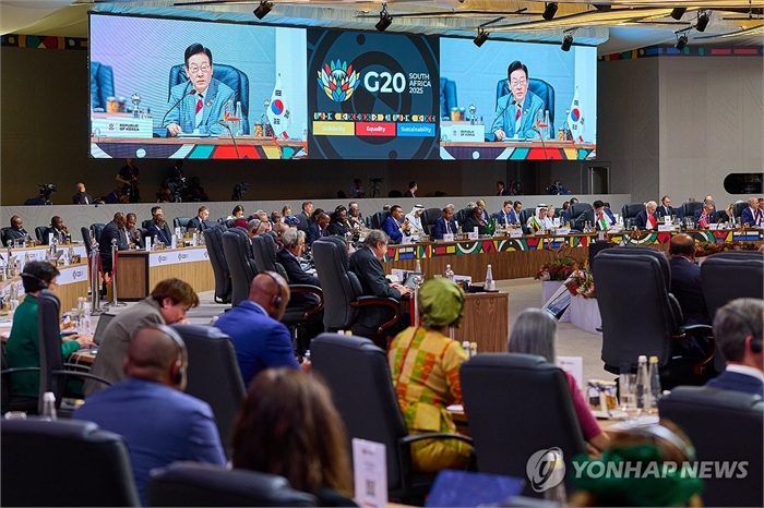 이재명 대통령, G20 정상회의 1세션 발언 (요하네스버그=연합뉴스) 한상균 기자 = 이재명 대통령이 22일(현지시간) 남아프리카공화국 나스렉 엑스포센터에서 열린 주요 20개국(G20) 정상회의 제1세션에서 발언하고 있다. 2025.11.22 [공동취재 제공. 재판매 및 DB 금지] xyz@yna.co.kr