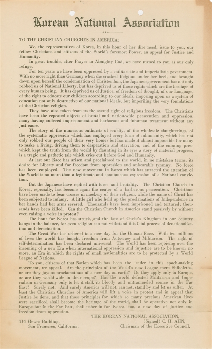 1919년 3월 대한인국민회 중앙총회장 안창호가 미국 기독교회에 보낸 호소문 [독립기념관 제공. 재판매 및 DB 금지]