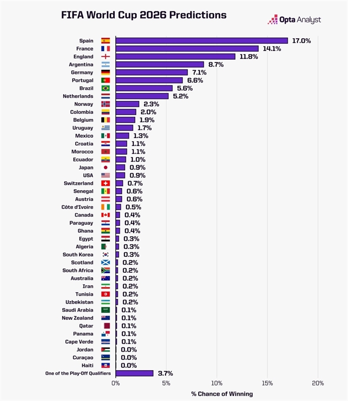 스페인에 이어 프랑스(14.1%), 잉글랜드(11.8%), 아르헨티나(8.7%), 독일(7.1%), 포르투갈(6.6%), 브라질(5.6%), 네덜란드(5.2%), 노르웨이(2.3%), 콜롬비아(2.0%)가 우승 확률 톱10을 구성했다.