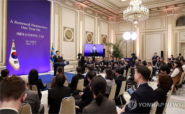 '새롭게 선 민주주의, 그 1년' 외신 기자회견 (서울=연합뉴스) 김도훈 기자 = 이재명 대통령이 3일 청와대 영빈관에서 열린 '새롭게 선 민주주의, 그 1년' 외신 기자회견에서 취재진 질문에 답하고 있다. 2025.12.3 [대통령실통신사진기자단] superdoo82@yna.co.kr