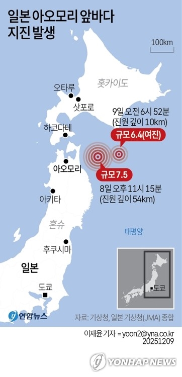 이어 일본 혼슈 동북부 아오모리현 앞바다에서 9일 오전 6시 52분께 규모 6.4로 추정되는 지진이 발생했다고 기상청이 발표했다.