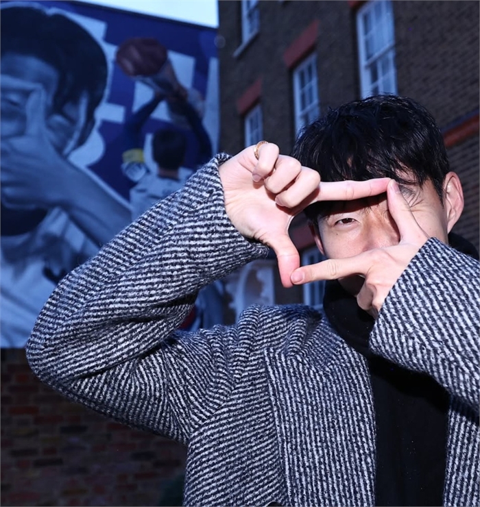 자신의 모습이 단긴 벽화 앞에서 찰칵 세리머니를 펼치는 손흥민 [토트넘 홋스퍼 SNS 캡처. 재판매 및 DB 금지]