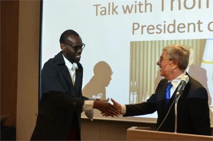 서울대서 토마스 바흐 국제올림픽위원회(IOC) 당시 위원장(오른쪽)과 만난 나숀 씨 [나숀 제공. 재판매 및 DB 금지]