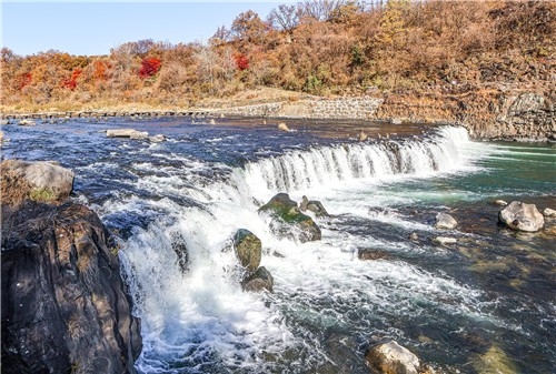 한탄강 상류에 있는 직탕폭포는 수직으로 떨어지는 여느 폭포와 달리 하천 면을 따라 옆으로 넓게 펼쳐져 있다.