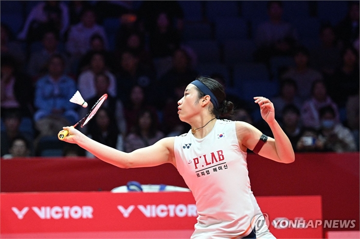 야마구치 아카네의 공격을 받아내는 안세영 [AFP=연합뉴스]