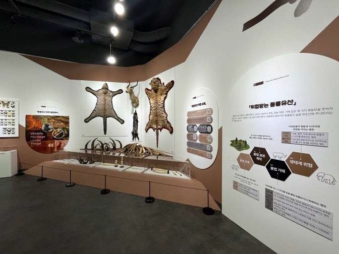 '위협받는 동물'을 주제로 한 공간에서는 불법적인 포획으로 희생된 호랑이, 표범 등의 가죽 표본과 상아, 물소 뿔 등도 볼 수 있다.