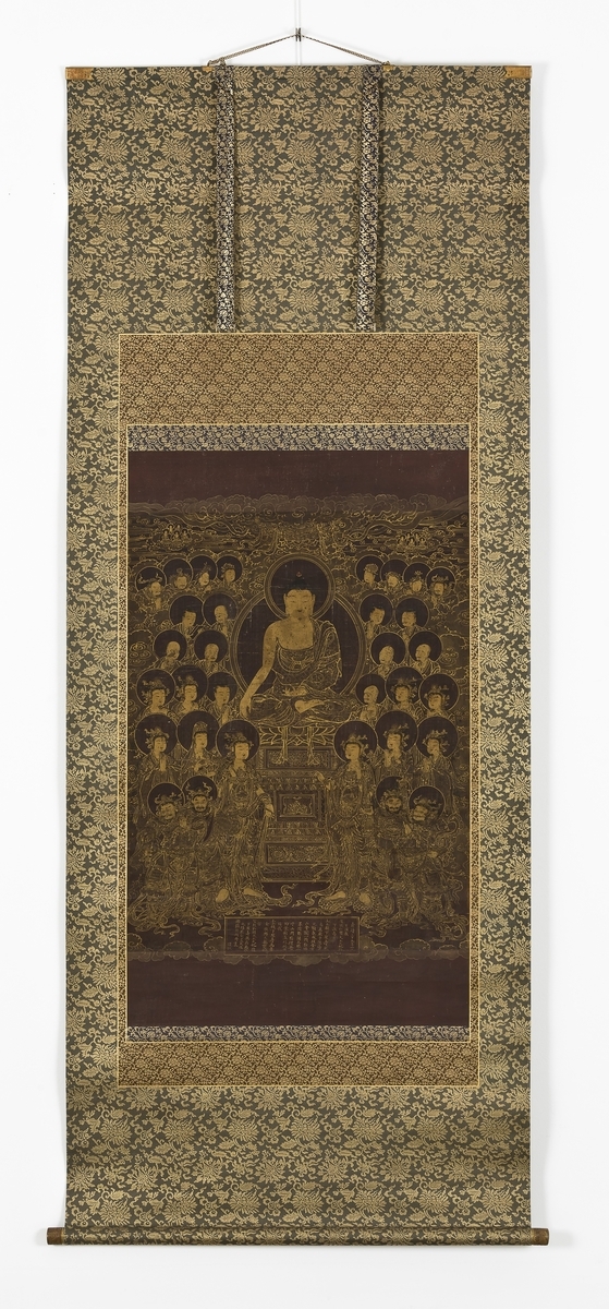 비단 바탕에 채색으로 영축산에서 석가모니불이 법화경을 설법하는 순간을 표현했다.