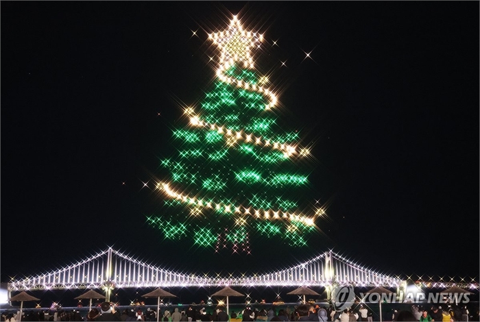 '미리 메리크리스마스' 드론쇼 (부산=연합뉴스) 강선배 기자 = 21일 부산 수영구 광안리해수욕장 일원에서 '미리 메리크리스마스'를 주제로 한 '광안리 M 드론라이트쇼' 특별공연이 펼쳐지고 있다.