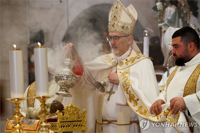 (로이터=연합뉴스) 25일 서안지구 베들레헴의 예수 탄생 교회에서 가톨릭 교회 예루살렘 라틴 총대주교인 피에르바티스타 피차발라 추기경이 자정 미사를 집전하고 있다.