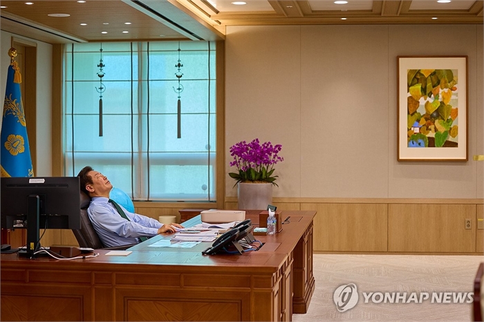 휴식 중인 이재명 대통령 (서울=연합뉴스) 대통령실은 이재명 대통령이 지난 3일 용산 대통령실 집무실에서 휴식하는 모습을 4일 SNS에 공개했다. 2025.9.4 [이재명 대통령 SNS. 재판매 및 DB 금지] photo@yna.co.kr