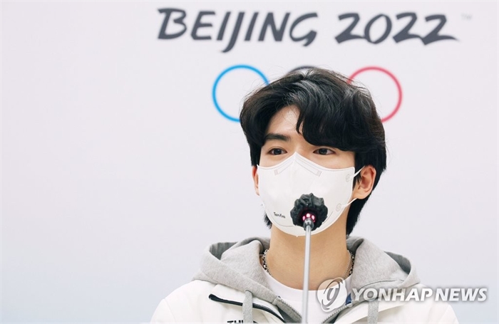 [올림픽] 취재진 질문에 답하는 '톱5' 차준환 (베이징=연합뉴스) 한종찬 기자 = 한국 피겨스케이팅 남자 싱글 역사상 첫 올림픽 '톱5'의 역사를 쓴 차준환(고려대)이 12일 오후 중국 베이징 시내 메인미디어센터(MMC)에서 기자회견을 열고 취재진 질문에 답하고 있다. 2022.2.12 saba@yna.co.kr