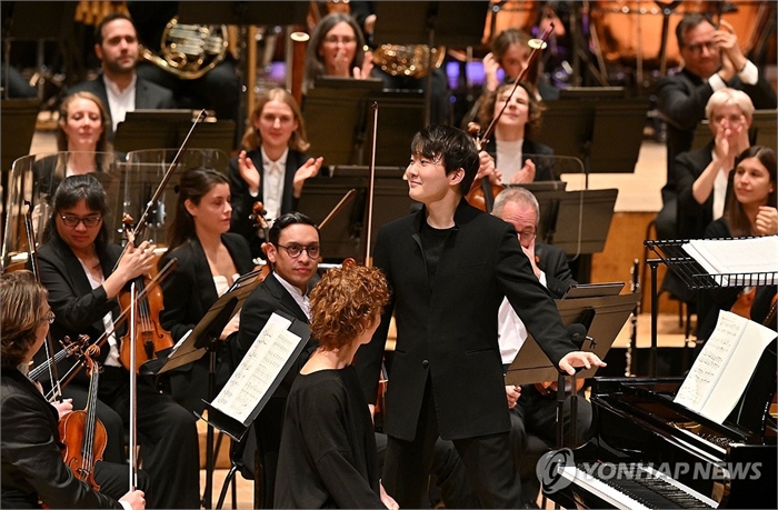 런던심포니와 협연하는 피아니스트 조성진 (런던=연합뉴스) 피아니스트 조성진이 20일(현지시간) 영국 런던 바비칸센터에서 열린 런던심포니오케스트라(LSO)와 협연에서 관객에게 인사를 하고 있다. 2025.11.21 [런던심포니오케스트라 제공. 재판매 및 DB 금지] photo@yna.co.kr