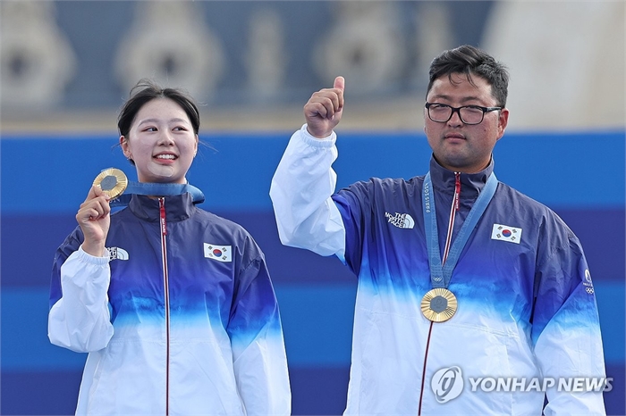 자랑스러운 양궁 남매 (파리=연합뉴스) 임화영 기자 = 2일(현지시간) 프랑스 파리 레쟁발리드에서 열린 2024 파리올림픽 양궁 혼성 단체 시상식에서 김우진과 임시현이 금메달을 목에 걸고 있다. 2024.8.2 hwayoung7@yna.co.kr