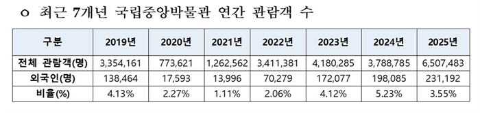 국립중앙박물관은 2025년 연간 관람객 수가 총 650만7천483명으로 집계됐다고 2일 밝혔다.