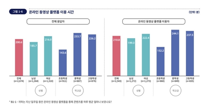 응답자 95.1%는 지난 일주일 동안 온라인 동영상 플랫폼 서비스를 이용한 적이 있다고 답했고, 시청시간은 일평균 200.6분, 약 3.3시간이었다. 학교급별로는 중학생이 233.7분으로 가장 많고 고등학생 226.2분, 초등학생이 143.6분이었다.