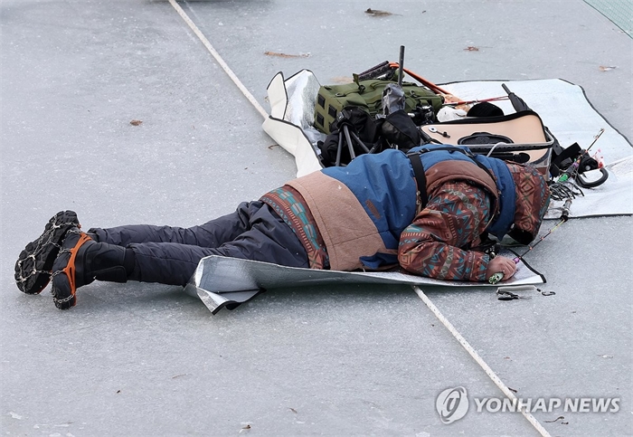 몇몇 강태공은 꽁꽁 얼어붙은 빙판에 엎드려 얼음구멍 가까이 얼굴을 들이밀며 산천어가 지나가는지 지켜봤다.