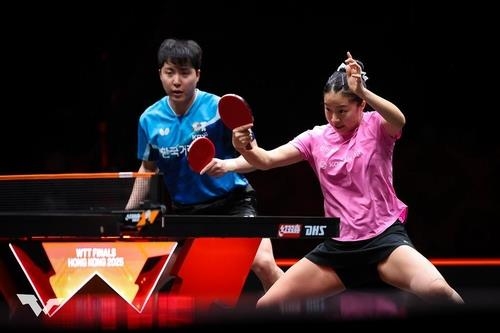 WTT 파이널스 홍콩 혼합복식 경기에 나선 신유빈(오른쪽)과 임종훈 [WTT 인스타그램 캡처. 재판매 및 DB 금지]