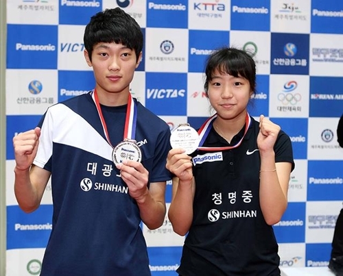 종합탁구선수권 혼합복식 은메달을 목에 건 조대성(왼쪽)과 신유빈 [대한탁구협회 제공. 재판매 및 DB 금지]