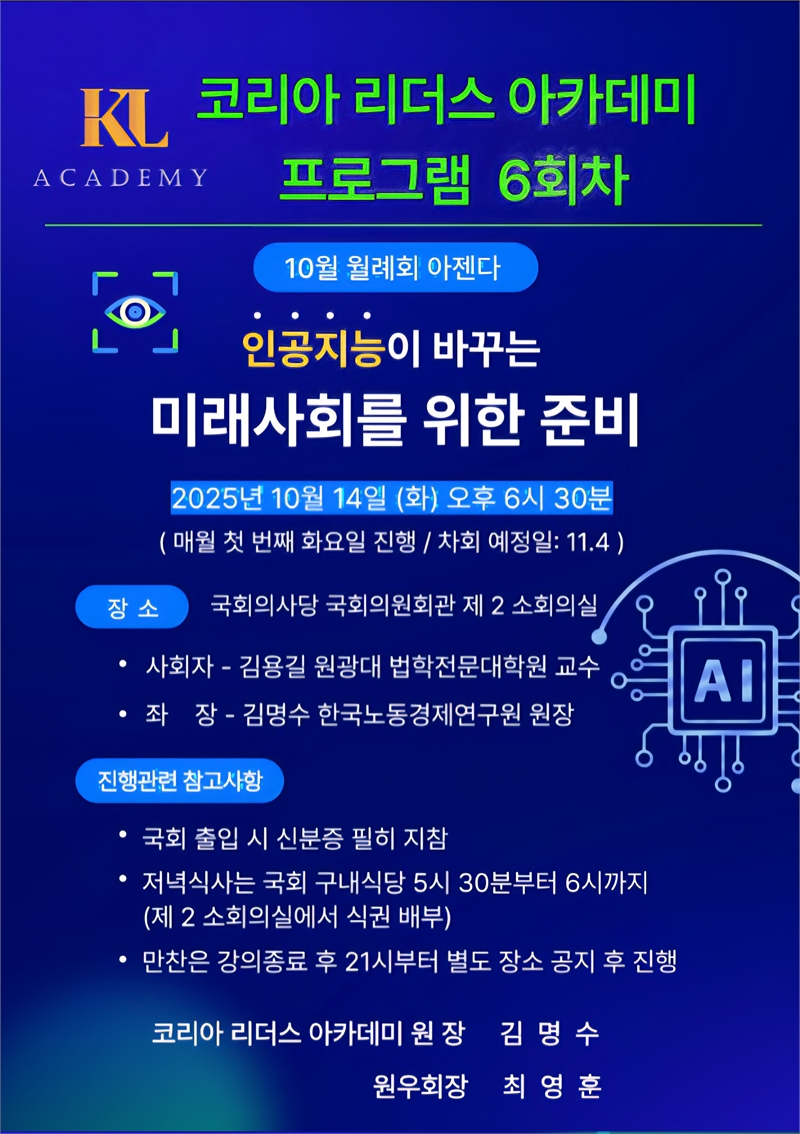 KLA코리아 리더스 아카데미(원장 김명수)가 오는 10월 14일 오후 6시 30분, 국회의원회관 제2소회의실에서 “인공지능이 바꾸는 미래사회를 위한 준비”를 주제로 특별 심포지엄을 연다. 이번 행사는 급변하는 기술 환경 속에서 미래를 선도할 지식과 통찰을 공유하기 위해 마련됐다. 이번 심포지엄에는 국내 인공지능 연구