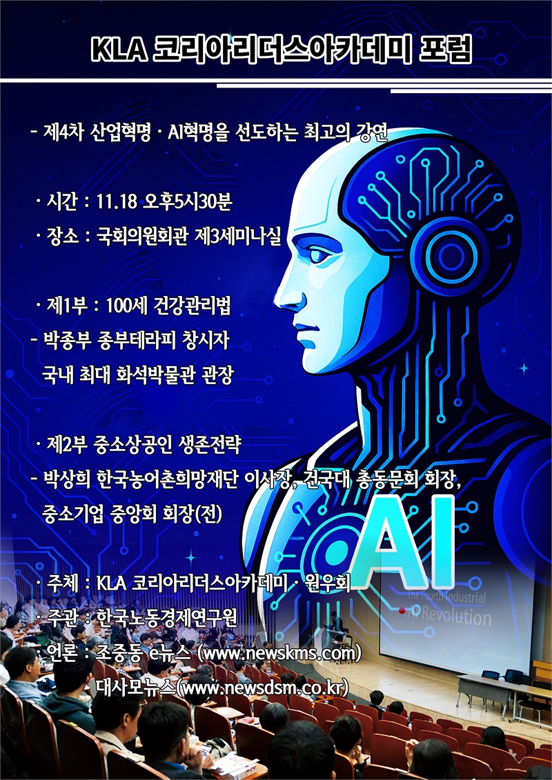 [조중동e뉴스=김혜빈 기자]제4차 산업혁명과 AI혁명이 본격화되는 시대, 미래 경쟁력의 해법을 찾기 위한 자리가 국회에서 열린다. 코리아리더스아카데미(원장 김명수)가 주체하는 ‘제4차 산업혁명· AI혁명을 선도하는 최고의 강연’ 포럼이 11월 18일 오후 5시 30분, 국회의원회관 제3세미나실에서 진행된다. 이번 포럼은