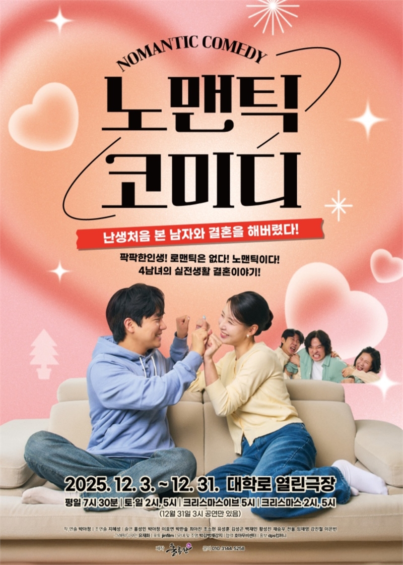 [조중동e뉴스=김혜빈 기자] - 12월3일~12월31일,요즘 세태 묘사 "난생처음 만난 남자와 결혼을 해버렸다!" 이 황당한 슬로건을 걸고 대학로 창작연극의 대표주자 artcrew 훌륭한이 로맨틱이 아닌 노-맨틱 코미디라는 제목으로 12월 따뜻한 선물처럼 찾아온다.연극 오백에 삼십, 보물찾기, 나의 장례식, 아동극의