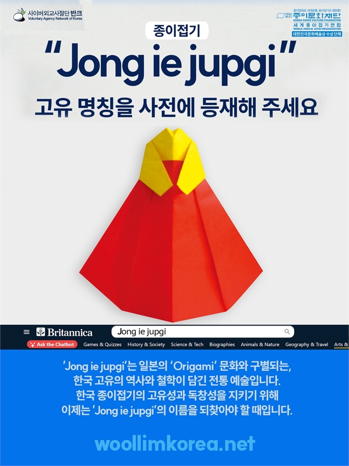 "한국 전통 명칭 '종이접기', 세계 사전에 등재 추진" 반크-종이문화재단, 영국 옥스퍼드 사전 등 해외 사전 등재 글로벌 캠페인 (서울=연합뉴스) 박현수 기자 = 사이버 외교사절단 반크가 종이문화재단·세계종이접기연합과 공동으로 한국 전통 고유 명칭인 '종이접기'(Jong ie jupgi)를 해외 주요 사전에 등재하