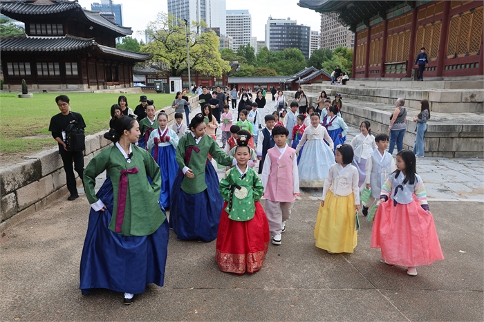 궁궐 돌아보는 어린이들(서울=연합뉴스) 서대연 기자 = 2025 가을 궁중문화축전 마지막 날인 12일 서울 중구 덕수궁에서 열린 '준명당 어린이 학교'에서 어린이들이 궁궐을 돌아보고 있다. 2025.10.12 dwise@yna.co.kr (끝)