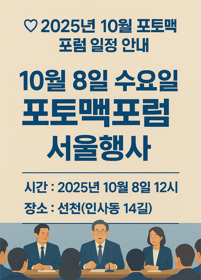 연사 : 이현주 전) 국제안보대사 박이도 경희대 명예교수 조창환 아주대 명예교수 안혜숙 문하과 의식 주간 [알림] ‘포토맥포럼’이 오는 10월 8일(수) 낮 12시, 서울 인사동 선천에서 정기 행사를 연다. 이번 모임의 주제는 **‘이재명 정부의 외교와 대외 환경’**이며, 이어서 자작시 낭송도 진행된다.행사에는 이현주