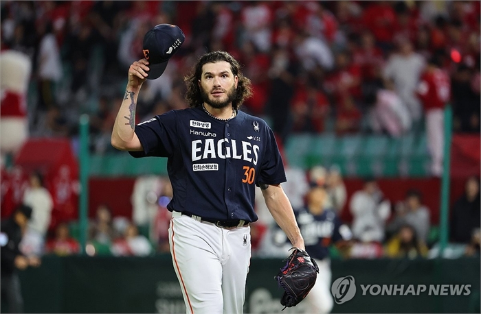 더그아웃 향하는 폰세 (인천=연합뉴스) 임순석 기자 = 1일 인천 SSG랜더스필드에서 열린 2025 프로야구 한화 이글스와 SSG 랜더스의 경기. 한화 폰세가 5회 말 투구를 마친 뒤 더그아웃으로 향하며 기뻐하고 있다. 2025.10.1 soonseok02@yna.co.kr