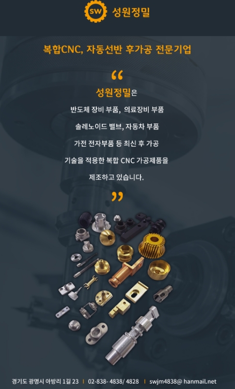 성원정밀은 전자, 자동차, 기계 산업 장비를 비롯해 철, 황동, 플라스틱 등 다양한 소재의 정밀 부품 가공이 가능하다. 특히 소형·중형 부품의 정밀도와 내구성 면에서 높은 평가를 받으며, 업계 내 탄탄한 입지를 구축했다. 하지만 신 대표는 여기에 안주하지 않는다.
