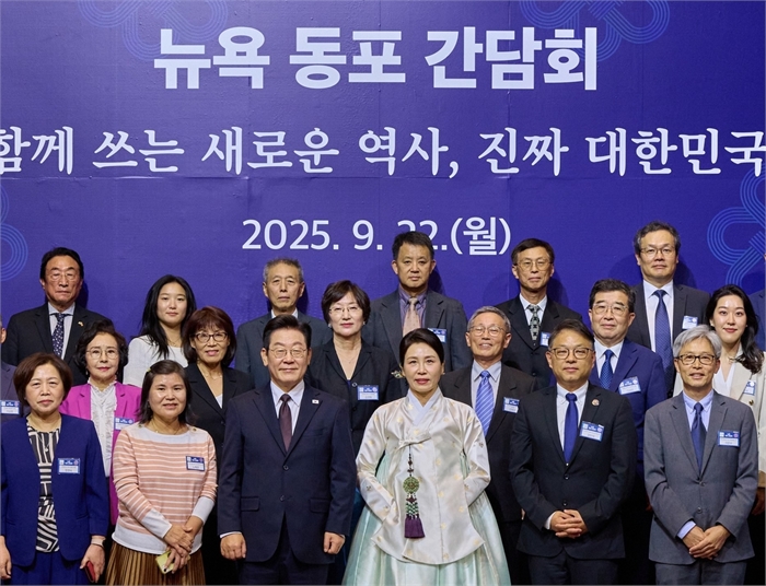 뉴욕 동포 간담회서 이재명 대통령과 함께한 김 위원장 (서울=연합뉴스) 지난 9월 22일(현지시간) 뉴욕의 한 호텔에서 열린 동포간담회에서 유엔총회 참석차 미국을 방문한 이재명 대통령 내외와 함께 기념사진을 찍은 김경화(뒷줄 왼쪽서 6번째) 위원장. [김경화 위원장 제공]