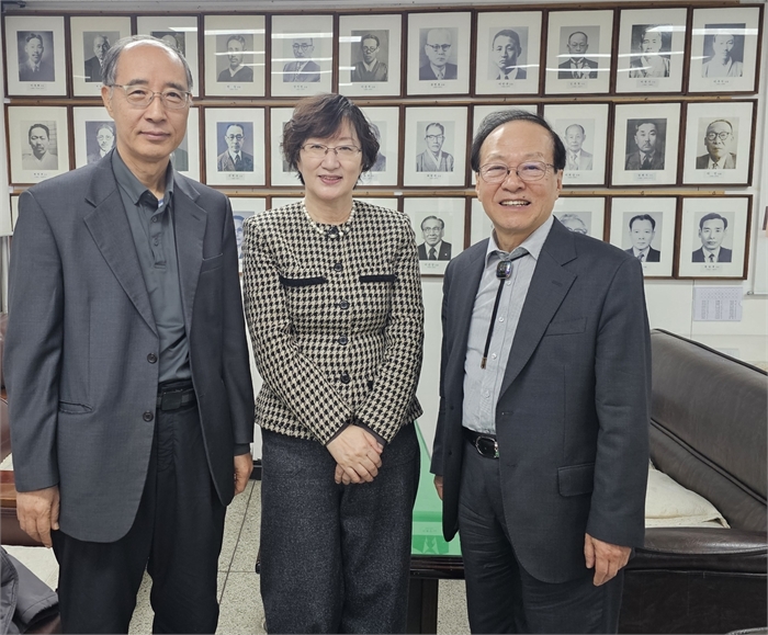 한글학회·세종대왕기념사업회장과 함께한 김 위원장 (서울=연합뉴스) 김경화(가운데) 위원장이 최근 한글학회에서 김주원(왼쪽) 회장과 최홍식 세종대왕기념사업회장을 만나 뉴욕 한글 뮤지엄 건립과 관련해 협의했다. 이들은 한글은 AI 시대에 가장 적합한 언어라는 데 뜻을 같이했다. [김경화 위원장 제공]