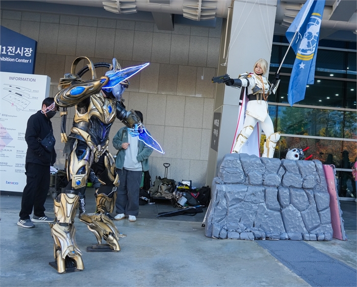 프로토스 대 헬다이버즈? (부산=연합뉴스) 김주환 기자 = 지스타 2025 개막 사흘째인 15일 오전 부산 해운대구 벡스코(BEXCO) 제1전시장 앞에서 '스타크래프트' 속 광전사(질럿)와 '헬다이버즈' 속 헬다이버로 분장한 코스튬 플레이어가 즉석에서 포즈를 취하고 있다. 2025.11.15 jujuk@yna.co.kr